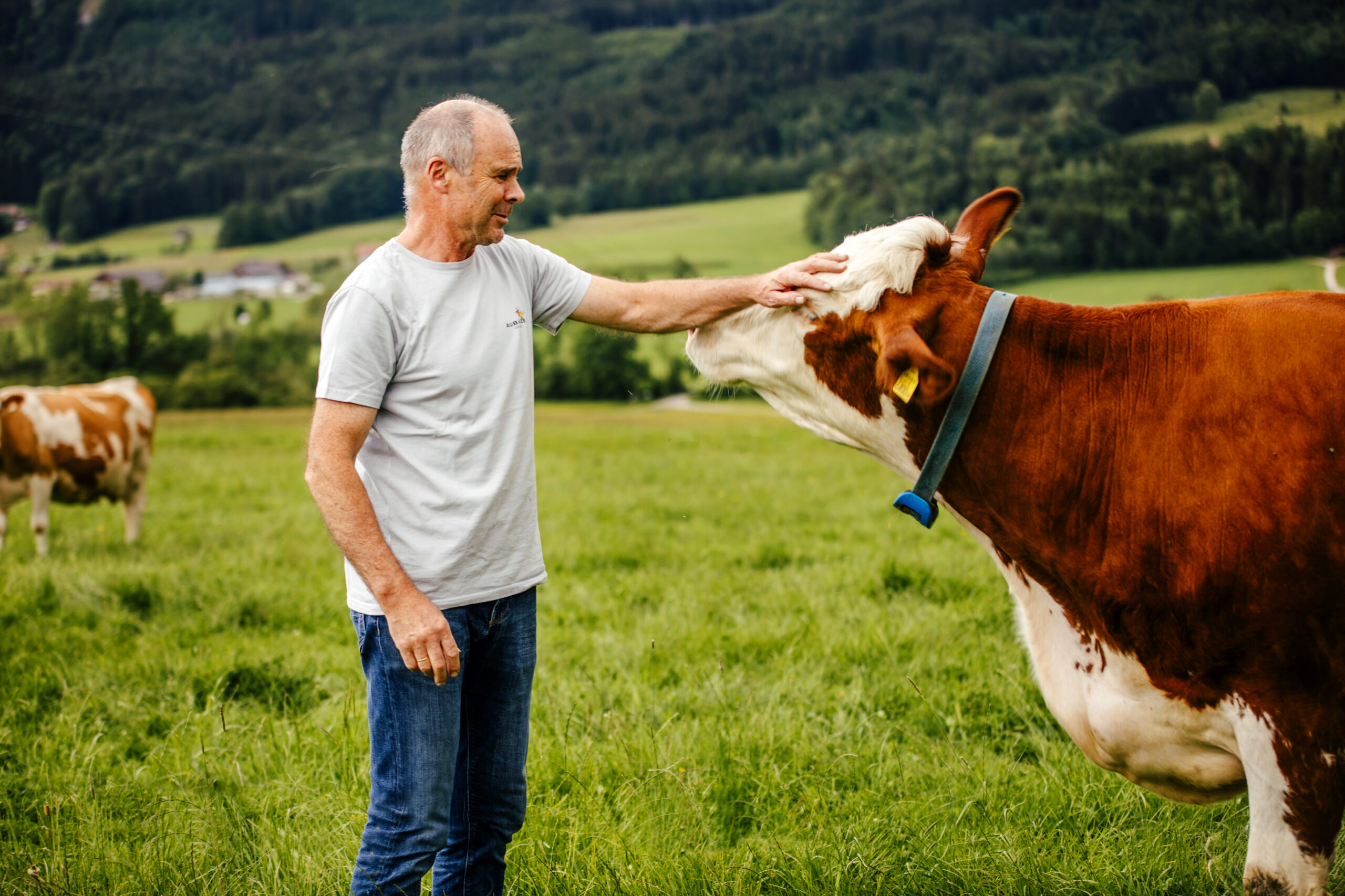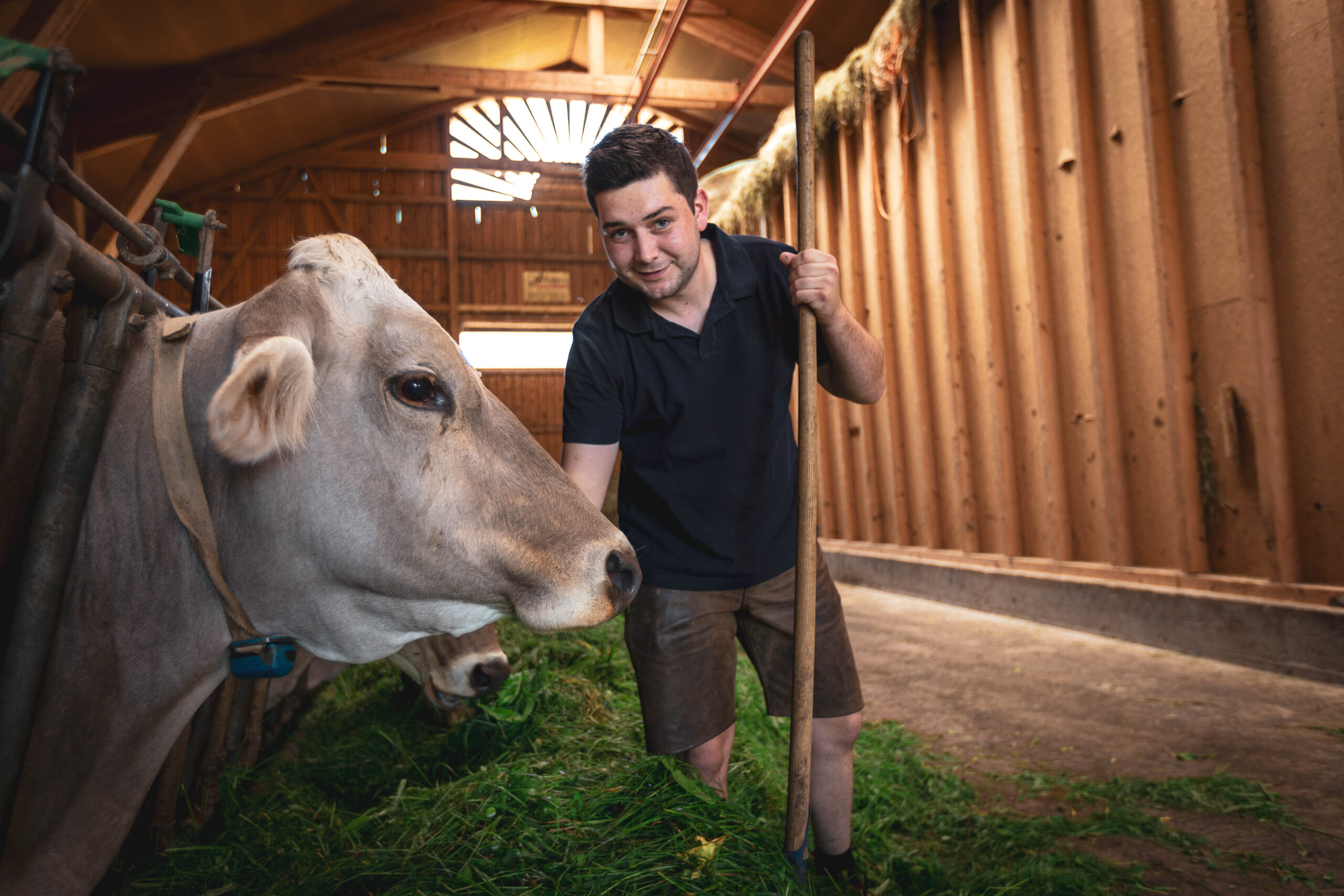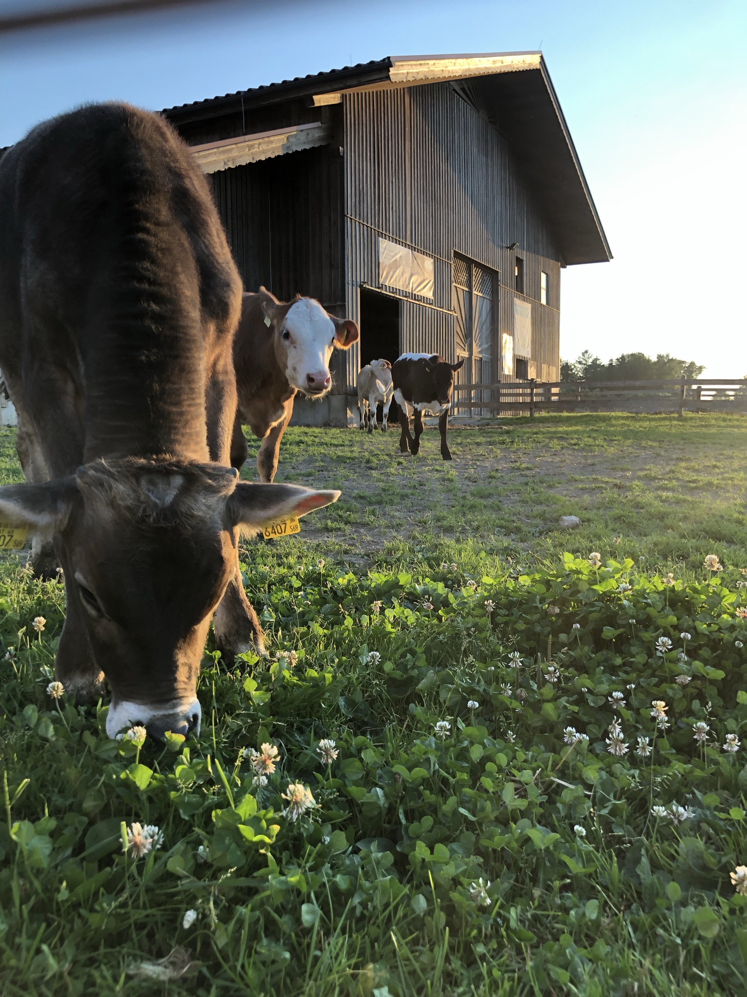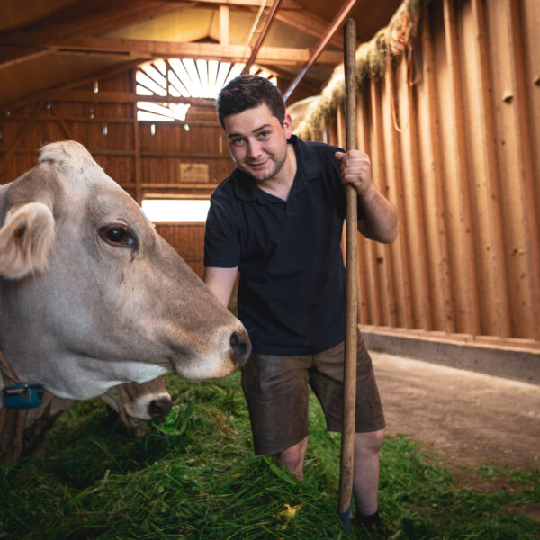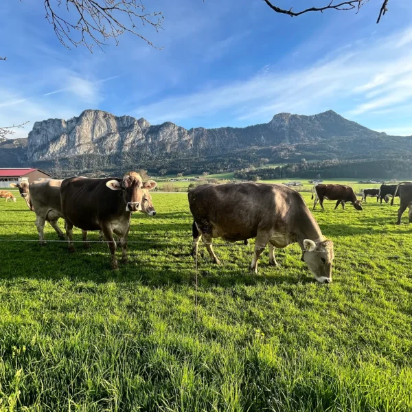 Damit wir uns noch stärker der Herstellung unserer eigenen Milchprodukte widmen können, haben wir die Jungviehzucht ausgelagert. Ab dem Frühling genießen unsere Kühe so viel Zeit wie möglich auf der Weide – tagsüber, wenn es nicht zu heiß ist, und in den angenehm kühlen Abendstunden. Sie haben jederzeit die Wahl, ob sie im Stall Heu fressen oder auf der Weide grasen möchten – ganz nach ihrem Wohlbefinden.